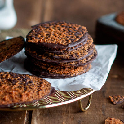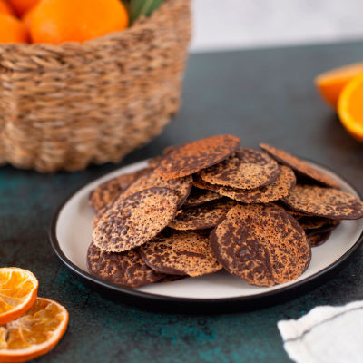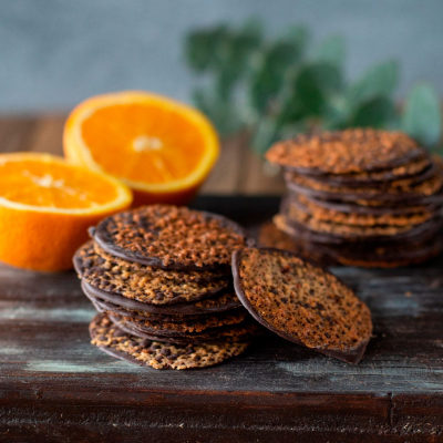 Si eres amante del chocolate bitter, te invitamos a disfrutar de estas crocantes galletas de almendra con caramelo, con notas de naranja bañadas en chocolate bitter. ¡Sin igual!