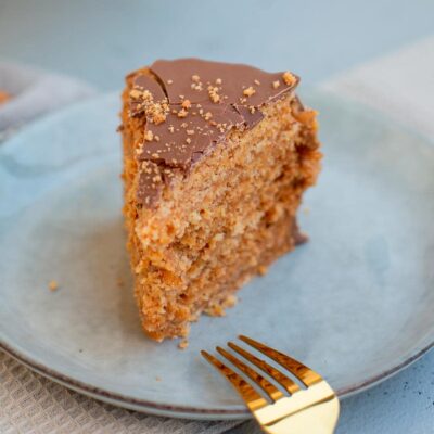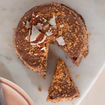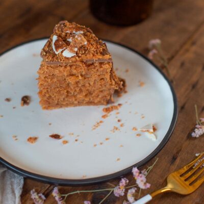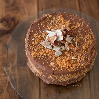 Capas de crocante de almendras con manjar blanco artesanal del sur de Chile, bañada en chocolate de leche con top de Melinas chocolate blanco.